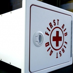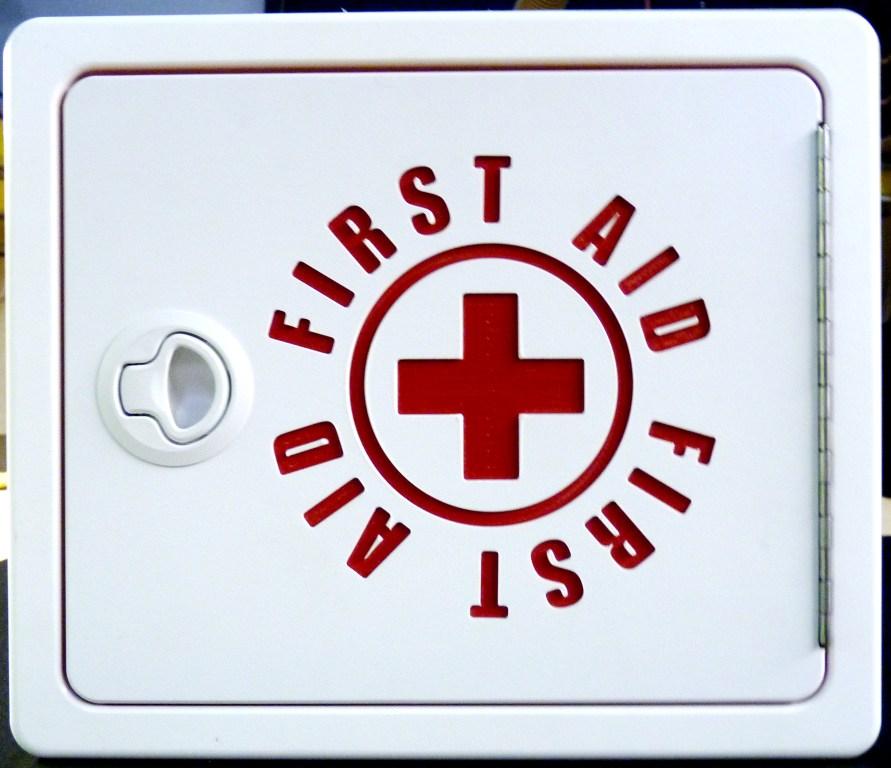 This compact cabinet offers excellent storage for critical first-aid supplies and medications. Construction first aid cabinet front view is all King Starboard, with the door panel fabricated from King Starboard Color Core -- so the red graphics are an integral part of the panel, not added on. This model comes standard with a white or black Southco non-locking polycarbonate slam latch, stainless steel piano hinge and all stainless fasteners.