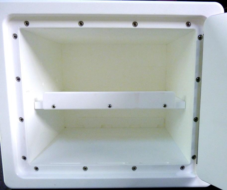 The enclosure can accommodate extinguishers up to 8 lb. capacity (the red example shown), and easily stores the 3 lb. models (white example) more typically found on recreational vessels.