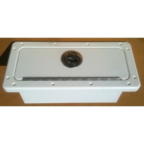 A step up in size from our smallest stock design glove box for boats, this midsize model is constructed entirely of King Starboard in your choice of 5 colors. This unit comes standard with a Whitecap Industries stainless steel mini non-locking latch and your choice of a SS piano hinge or SS face hinges.