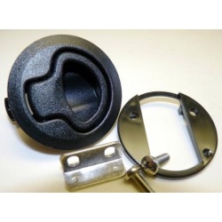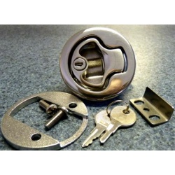 Small Locking Slam Latch - 316 Stainless Steel - Whitecap Industries #6138 - Free Shipping In The United States $39.95The same yacht-quality fitting as the small Whitecap SS non-locking latch described above, but with a unique splined key and Whitecap small ss locking backlock to secure your belongings. Single round hole installation. Spring loaded latch operates with pull up lift ring and can be opened from inside the closure as well. Includes 1 locking slam latch with key, 1 retaining ring & 2 mounting screws, 1 adjustable latch catch. Dimensions 1.75" outside dimension, fits 1.5" diameter hole.