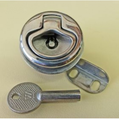The same yacht-quality fitting as the small Whitecap SS non-locking latch described above, but with a unique splined key and Whitecap small ss locking backlock to secure your belongings. Single round hole installation. Spring loaded latch operates with pull up lift ring and can be opened from inside the closure as well. Includes 1 locking slam latch with key, 1 retaining ring & 2 mounting screws, 1 adjustable latch catch. Dimensions 1.75" outside dimension, fits 1.5" diameter hole.