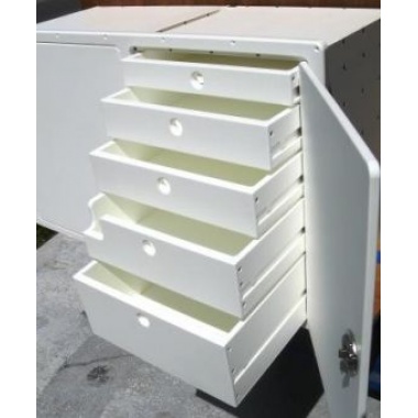 The tackle center's 10 drawers all have an inside measurement of 14" from front to back. Five of the drawers have an inside width of 15.75" and 5 are 19-7/8" wide. Overall drawer heights range from 2.25"H to 6.75"H. All 10 drawers incorporate a "lift and pull" feature that keeps them securely closed when not in use. The drawers are protected by double doors set into the unit's frame, with each door opening on a stainless steel hinge and secured by your choice of white or black Southco polycarbonate slam latches as part of the base price.